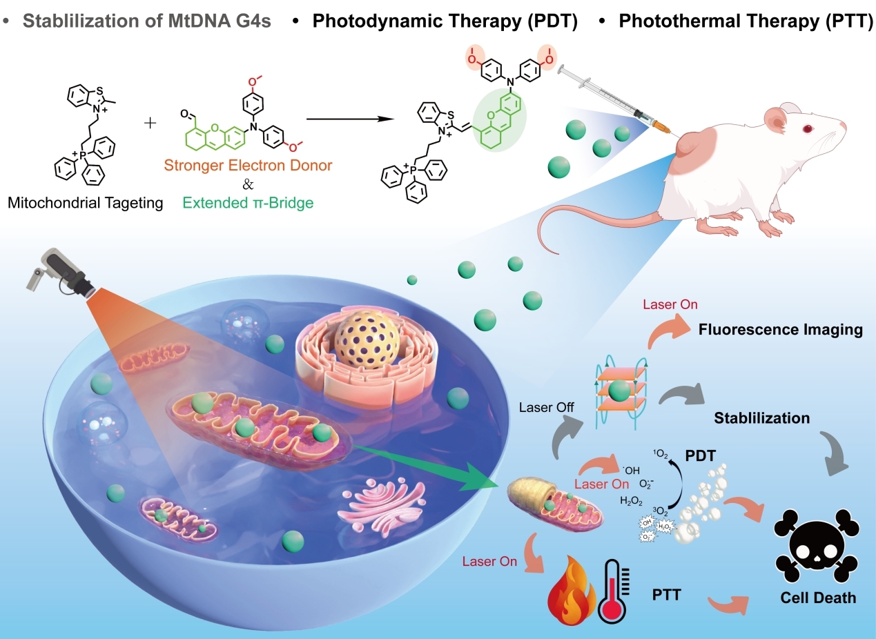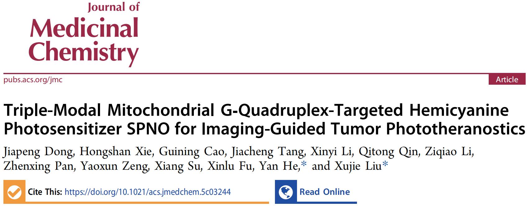 近日,bevictor伟德官网生物材料团队何燕副教授和刘旭杰副教授在药物化学领域国际权威期刊《Journal of Medicinal Chemistry》(IF:6.8)上在线发表题为“Triple-Modal Mitochondrial G-Quadruplex-Targeted Hemicyanine Photosensitizer SPNO for Imaging-Guided Tumor Phototheranostics”的研究论文。该研究成功设计并构建了一种靶向线粒体DNA G-四链体的新型近红外半花菁光敏剂SPNO,成功整合了荧光成像、G4稳定化和光治疗三模态功能,实现了成像引导的肿瘤协同治疗。
