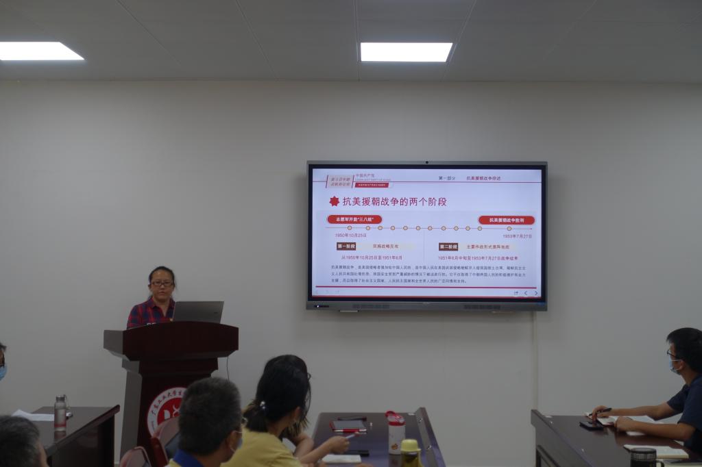 赵昱以“抗美援朝”为主题,讲述了抗美援朝战争过程、抗美援朝精神的丰富内涵和时代价值。她通过列举抗美援朝战争中“战略反攻”阶段的五次战役、朝鲜停战谈判、“积极防御”阶段的若干重要事件以及实现朝鲜停战等史料,高度评价了中国人民志愿军以“钢少气多”力克“钢多气少”、“打得一拳开,免得百拳来”、为保卫国家安全、维护世界和平建立的丰功伟绩。抗美援朝战争充分展示了中国人民不畏强暴、敢于胜利的钢铁意志,弘扬和光大了爱国主义精神、革命英雄主义精神、革命乐观主义精神、革命忠诚精神、国际主义精神。抗美援朝精神为我们大力弘扬爱国主义精神、为我们进行具有许多新的历史特点的伟大斗争、为我们维护世界和平与人类进步事业提供了强大动力。