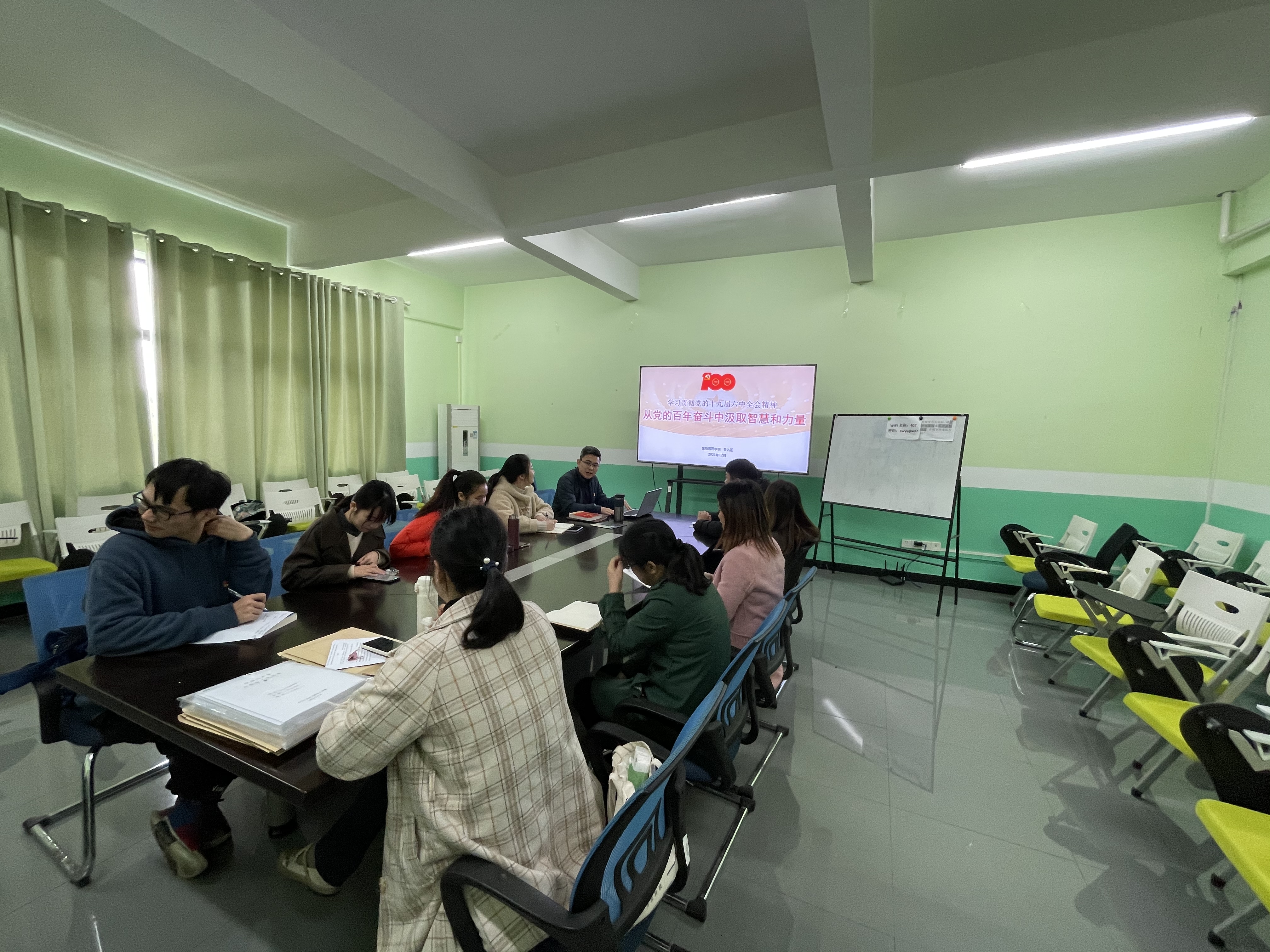 2021年12月29日下午,学院生物工程系党支部与学生第二党支部在科技南楼407会议室召开学习贯彻党的十九届六中全会精神学习会。由学院副院长黄名正给党员们进行专题学习辅导,两个党支部全体党员参加会议。